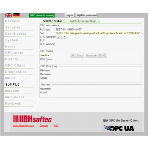 En fördel med IBHsoftecs lösning är att det är en Server-/Client version. Genom OPC-Client-funktionen är det också möjligt att utbyta data mellan OPC-servrar. Med denna funktion kan t.ex. data utbytas med styrningar eller anna utrustning med OPC UA från olika tillverkare. Konfiguration av Client funktionen görs i webbgränssnittet.